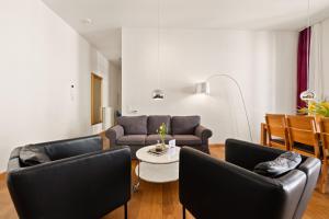 Inside the apartment, guests will find a fully equipped kitchen featuring a dishwasher, microwave, toaster, refrigerator, coffee machine and electric kettle alongside complete kitchenware and a dining table with a high chair for children. The living room offers a seating area with a sofa and flat-screen TV including streaming services and pay-per-view channels. Additional in-room amenities include bed linen, towels, heating, wardrobe or closet space, safety deposit box, ironing facilities with iron and board as well as washing machine and tumble dryer options.