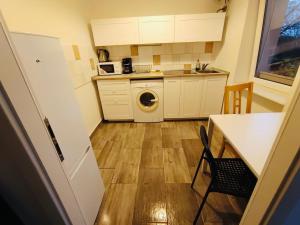 The accommodation features one bedroom with heating and a washing machine. A flat-screen TV is provided for entertainment while the full kitchen allows guests to prepare meals at their leisure.