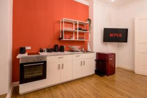 Inside the apartment you will find one separate bedroom with two beds along with a living room featuring parquet flooring and a seating area equipped with a flat-screen TV that supports streaming services. The fully fitted kitchen includes an oven, stovetop, refrigerator, toaster as well as tea and coffee making facilities including an electric kettle and coffee machine plus kitchenware for meal preparation. Additional amenities consist of ironing facilities including iron and board, washing machine, work desk, wardrobe or closet, clothes drying rack, heating system, baby cot/crib availability, sofa bed, carpeted floor sections, non-feather pillows, towels and bed linen.