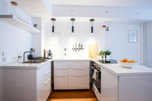 Apartament posiada jedną sypialnię wyposażoną w łóżko, szafę oraz poduszki niepierzowe dla większego komfortu. Dobrze wyposażony aneks kuchenny zawiera piekarnik, płytę grzewczą, lodówkę, czajnik elektryczny, ekspres do kawy oraz zestaw do przygotowywania herbaty i kawy wraz z pełnym zestawem naczyń kuchennych i stołem jadalnym. Część wypoczynkowa obejmuje sofę oraz biurko do pracy dostosowane do różnych potrzeb.