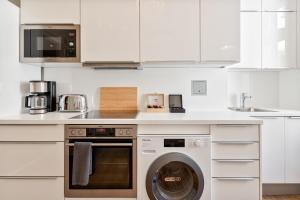 The fully fitted kitchen contains modern appliances including an oven, stovetop, microwave dishwasher refrigerator coffee machine electric kettle toaster tumble dryer and all necessary kitchenware for meal preparation served at the dining table. Entertainment needs are met through a flat-screen TV offering streaming services like Netflix plus bedside sockets for device charging. Additional conveniences include private check-in/out fire extinguisher smoke detector lift access to upper floors outdoor furniture on the balcony quiet street views washing machine internet service coverage in all areas.