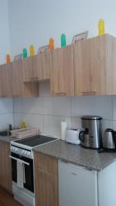 Accommodation includes one living room, one separate bedroom, and one bathroom equipped with a shower and hairdryer. Guests can enjoy the fully equipped kitchenette featuring an oven, stovetop, refrigerator, toaster, coffee machine and kitchenware alongside a dining area. Additional room amenities comprise parquet flooring, heating, wardrobe or closet space as well as bed linen and towels.