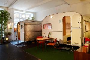 Ubytování zahrnuje moderní trojlůžkové pokoje ve stylu továrny s vysokými stropy a velkými okny. Každý pokoj má zvukotěsné stěny a samostatný vstup. Pokoje jsou vybaveny postelemi pro dva hosty, šatními skříněmi, posezením i venkovní jídelnou s výhledem do vnitřního nádvoří nebo na zahradu. Soukromé koupelny mají sprchové kouty typu walk-in a fén na vlasy, u retro karavanů či chat jsou sociální zařízení společná mimo jednotky.