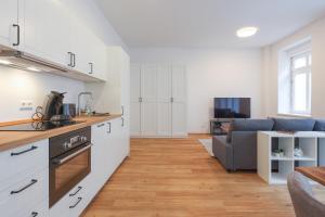 The apartment comprises one separate bedroom and a living room featuring a sofa bed and flat-screen TV with satellite channels for entertainment. Guests benefit from a fully equipped kitchen that includes an oven, stovetop, refrigerator, dishwasher, coffee machine and toaster alongside a dining table where meals can be enjoyed comfortably. The bathroom provides modern amenities including a walk-in shower without steps and hairdryer.