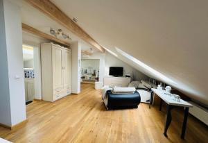 Inside, guests will find a kitchenette equipped with an oven, stovetop, microwave, refrigerator, minibar, coffee machine, toaster, electric kettle as well as kitchenware for dining needs. The living area features seating including a sofa and work desk alongside amenities such as heating, hardwood flooring, wardrobe or closet space, iron facilities and bed linen.