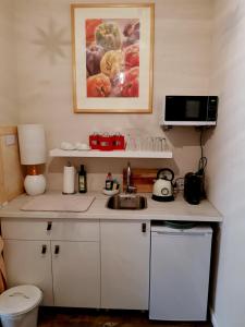 The apartment features one bedroom with air conditioning, hardwood flooring, and synthetic as well as feather pillows for added comfort. Guests can enjoy an equipped kitchenette with a stovetop, refrigerator, microwave, toaster, coffee machine, electric kettle, kitchenware and dining table for convenient meal preparation. The bathroom includes a shower with complimentary toiletries such as shampoo and conditioner along with a hairdryer.