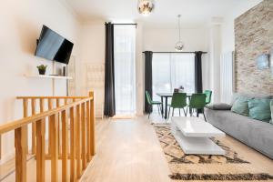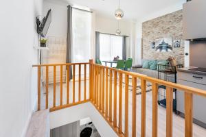 The accommodation features one bedroom with two beds alongside a living room that includes a sofa bed and seating area for relaxation or work purposes using the provided desk space. Guests can enjoy a fully equipped kitchenette fitted with a stovetop, refrigerator, microwave, dishwasher, toaster, coffee machine as well as kitchenware plus an electric kettle.